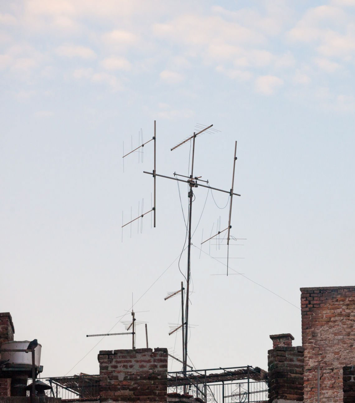 Television antennas, VHF and UHF frequencies, at the top of a European roof. VHF and UHF are two of the main TV transmission and reception systems.”n”nPicture of a bunch of TV antennas on a roof of a European building, receveing VHF and UHF frequencies.